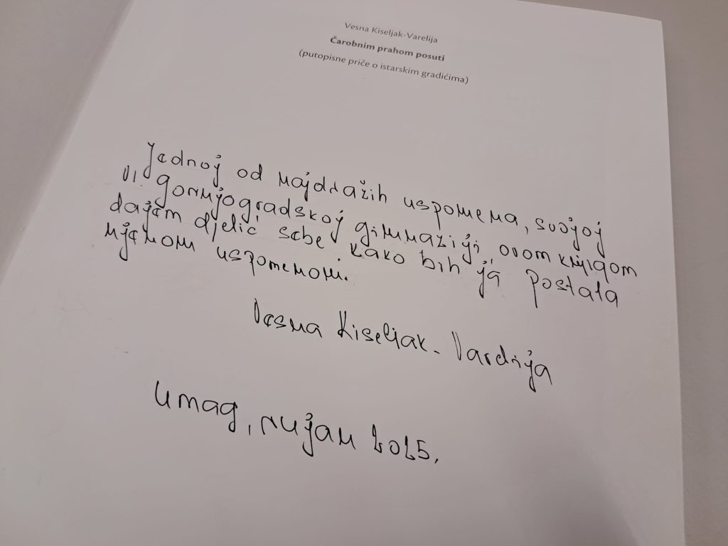 Ovih dana primili smo prekrasan poklon za našu školsku knjižnicu: knjigu čija je autorica bivša učenica Gornjogradske gimnazije, gđa Vesna Kiseljak-Varelija. Za nastanak knjige zahvaljuje i svojim gimnazijskim profesorima Povijesti, Hrvatskog jezika i Likovne umjetnosti Božidaru Bistričiću, Ivki Modri i Jasenki Mirenić.