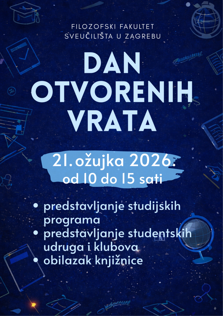 U subotu, 21. ožujka održat će se Dan otvorenih vrata Filozofskog fakulteta Sveučilišta u Zagrebu. Taj dan svi zainteresirani mogu se upoznati sa svim studijskim programima koji se mogu studirati na Filozofskom fakultetu, saznati sve o mogućnostima kombiniranja različitih studija, a istovremeno i o postupku prijave i upisa te o dinamičnom studentskom životu na Filozofskom.