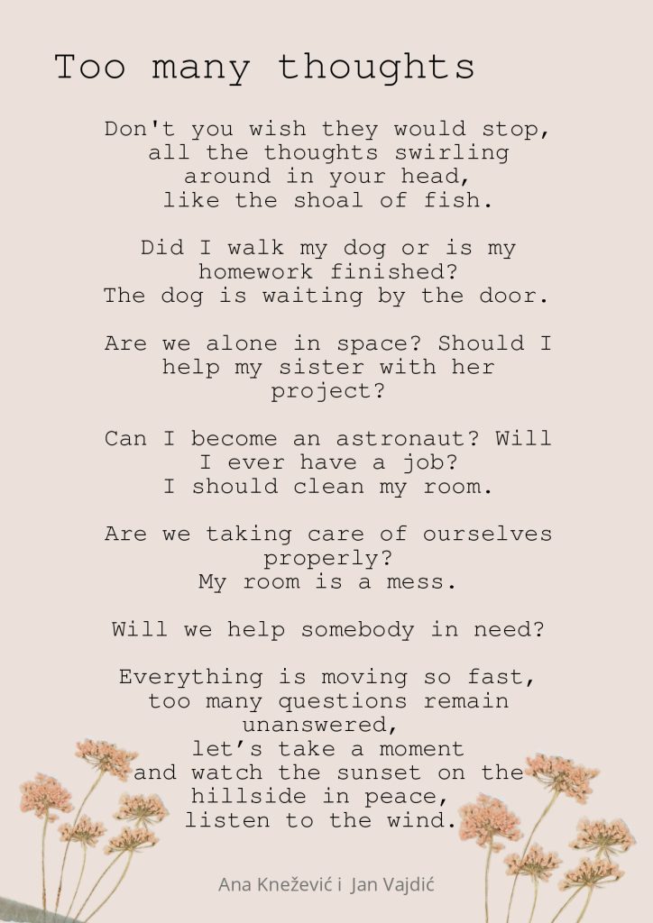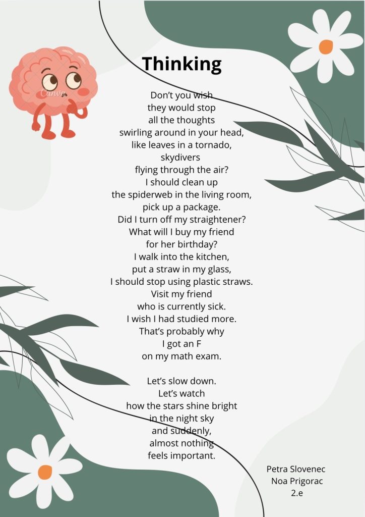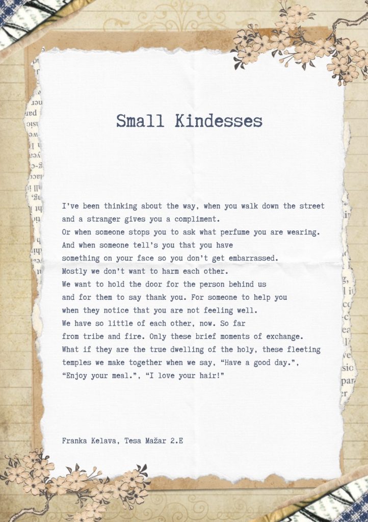 Mnogi važni dani obilježavaju se u ožujku: Dan očeva, Međunarodni dan žena, Svjetski dan voda, Dan svetog Patrika i prvi dan proljeća. Ove su godine učenici drugih razreda na nastavi engleskog jezika ipak obilježili jedan drugi datum – 21. ožujka ili Svjetski dan poezije. Čitali su dvije pjesme iste autorice, Danushe Laméris, i razmišljali na koje načine možemo biti ljubazni jedni prema drugima te koje se sve misli često roje našim glavama. U nastavku pročitajte neke od njihovih radova, kao i dvije originalne pjesme te razmislite kako sve pokazujete ljubaznost neznancima oko sebe. Sretan vam Svjetski dan poezije!